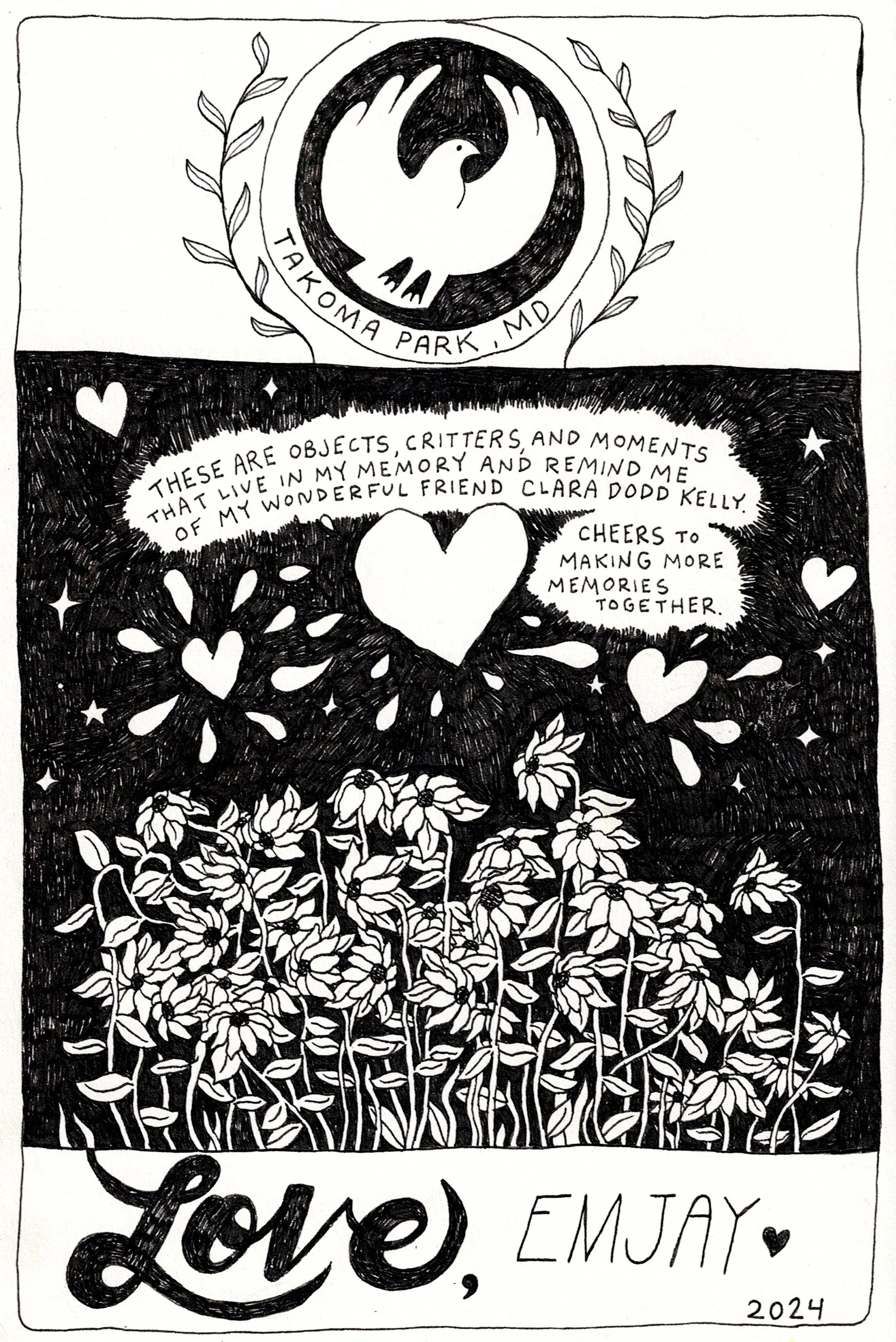 This zine is inspired by one of my oldest and most cherished friends, Clara. Inspired by summer days together, I illustrated snapshots of memories, items, and places that encapsulate how it feels to be with her.